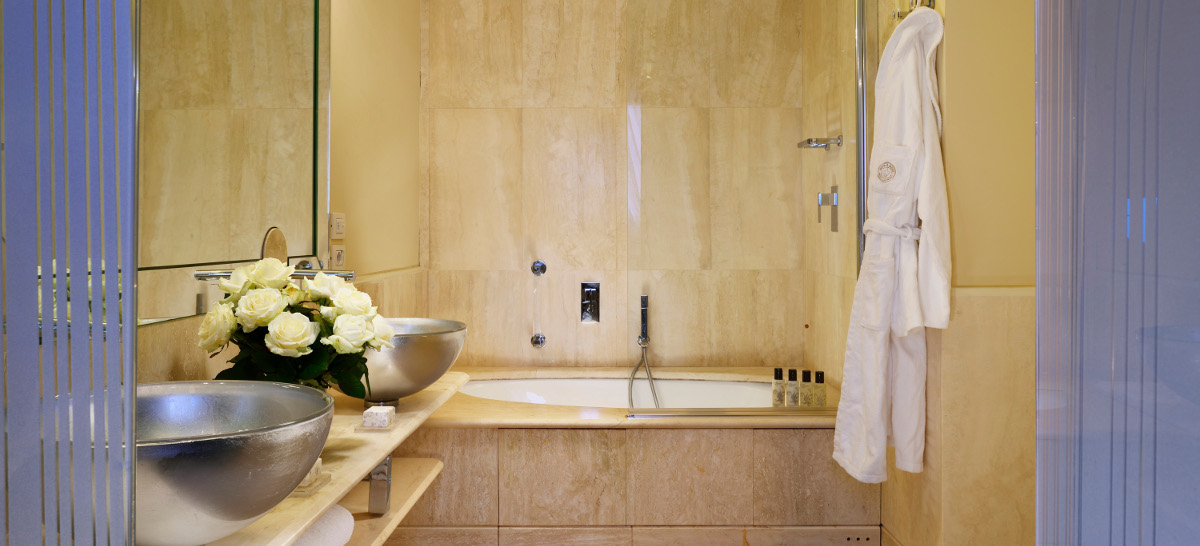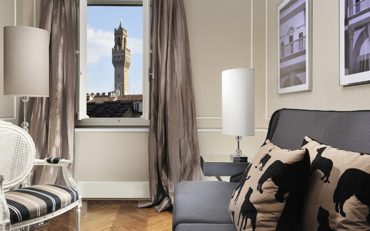 Our two-bedroom Suite in Florence with whirlpool bath is composed by two spacious interconnecting suites of 45 sqmt / 484 sq ft. each (a total of 90 sqmt / 968 sqft). Fully refurbished by the renowned Architect Benelli, this designer suite overlooks the pedestrian Via del Corso or the tiny square Del Giglio, right in the heart of Florence. The wide full marble bathroom is equipped with a whirlpool bath, hairdryer, magnifying mirror, fluffy terry towels, slippers and fine bathrobes. Courtesy kit with ‘soft touch’ bottles.